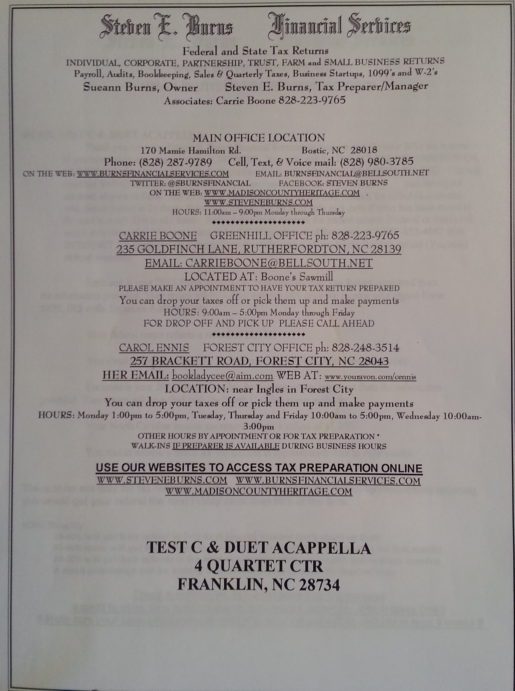 DROP OFF 24/7 IN A LOCKED MAIL BOX BY OUR OFFICE DOOR PUT YOUR INFO IN THE BOX US THE KEY IN THE BOX TO LOCK THE BOX PUT KEY BACK IN THE BOX THROUGH THE LETTER SLOT LEAVE YOUR INFORMATION AT ONE OF OUR SATELLITE OFFICES IN GREENHILL OR FOREST CITY USE US MAIL, FED EX, OR UPS TO MAIL YOUR INFORMATION E-MAIL YOUR INFORMATION TO BURNSFINANCIAL@BELLSOUTH.NET (SEND TEST EMAIL FIRST) FAX YOUR INFORMATION TO: (828) 287-9789 MAKE SURE YOU DON'T FAX TO THE WRONG NUMBER TEXT A PICTURE AND/OR INFORMATION TO 828-980-3785 TEXT PICTURES OF YOUR W-2'S AND 1099'S. OTHER INFORMATION YOU CAN USE TEXT NEW CUSTOMERS MUST TEXT A PICTURE OF YOUR DRIVER'S LICENSE AND SOCIAL SECURITY CARD SECURE PORTAL: WE WILL USE A ‘CLOUD’ ACCOUNT AND YOU CAN UPLOAD YOUR INFO DIRECTIONS FOR SECURE PORTAL CONTACT US SO WE CAN SET UP AN ACCOUNT FOR YOU YOU WILL RECEIVE AN E-MAIL WITH DIRECTIONS FOR ACCESSING YOUR ACCOUNT UPLOAD YOUR INFORMATION NEW CUSTOMERS MUST INCLUDE A PICTURE OF YOUR DRIVER'S LICENSE AND SOCIAL SECURITY CARD WE WILL COMPLETE YOUR RETURN AND UPLOAD TO YOUR "CLOUD" ACCOUNT YOU CAN ACCESS YOUR RETURN AT YOUR CONVENIENCE SIGN YOUR DOCUMENTS AND UPLOAD WE WILL PULL THE SIGNATURE DOCUMENTS ARRANGE PAYMENT PAYPAL, DEBIT OR CREDIT CARD, CHECK OR CASH WE WILL THEN FILE YOUR RETURN IF YOUR THE IRS REJECTS YOUR E-FILED RETURN, WE WILL MAKE CORRECTIONS AND PROVIDE A PAPER COPY FOR FILING |